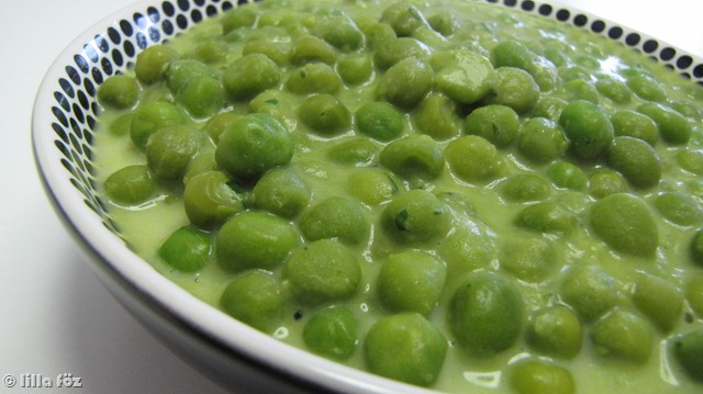 A felhevített olajon átforgatom a borsót, majd kevés vizet öntök alá, és fedő alatt megpárolom. Leszűröm a levét, hozzáadom a borsó negyedét-harmadát és összeturmixolom. A borsópürét a maradék borsóhoz adom, annyi tejet adok hozzá, hogy elérje a nekem szimpatikus főzelék-állagot, petrezselymet keverek bele, és kevés cukorral és sóval ízesítem.