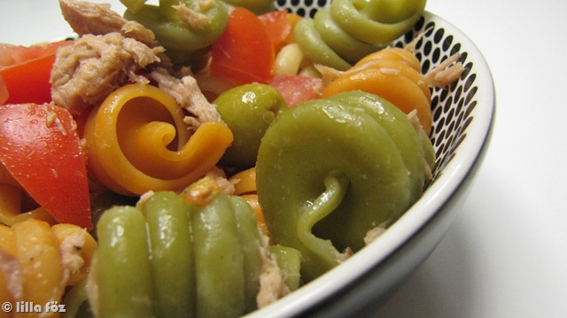 Újabban kb. heti egyszer halat kell készítenem, mert kiderült, hogy igény van rá. Mivel engem az egész műfaj nem igazán vonz (finoman szólva), ezért az alapanyagok köre korlátozott – tonhalkonzerv, lazac szelet, pangasius filé, esetleg valami más fehér húsú, lehetőleg minél kevésbé halszagú tengeri halfilé. Volt még itthon tonhalkonzerv, úgyhogy kb. 15 perc alatt összedobtam egy tésztasalátát. Állítólag nagyon finom.