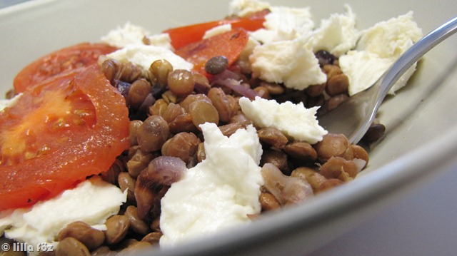 A lencsét leszűröm, leöblítem, és itatóspapírra teszem száradni. A hagymát félbevágom, és vékonyan felszeletelem (én egy kicsit meg is pároltam, hogy ne legyen gyomorégés a vége, aki bírja nyersen, az ezt a lépést kihagyhatja). A mozzarellát kis darabokra tépem, és a paradicsomot felkarikázom. A lencsét összekeverem a hagymával, a mozzarellával, az olajjal és a citromlével, és kicsit megsózom. Egy serpenyőben kevés olívaolajat hevítek, és oldalanként pát perc alatt meggrillezem a paradicsomszeleteket. a lencsesalátát tányérokra szedem, és a paradicsomkarikákkal a tetején tálalom. Lehet a tetejére apróra vágott petrezselymet vagy koriandert szórni.
