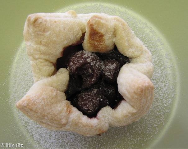 A tejben elkeverem a cukrot és a pudingport, és megfőzöm, és miután lehúzom a tűzhelyről, belekeverem a kockákra tört csokoládét. Időnként megkeverem hűlés közben, hogy ne bőrösödjön meg. Kb. 4 mm vastagra nyújtom a leveles tésztát, és 12 négyzetre vágom – én ezt az utóbbi lépést kihagytam, mert a 6 lapra nyújtott tésztát elég volt félbevágni. A sütőt előmelegítem 200 fokra, és egy 12 lyukú muffintepsit vékonyan kiolajozok, és a mélyedéseket kibélelem a tésztával. A csokoládékrémet elosztom a kosárkákban, mindegyikbe nyomok 4-5 szem rumos meggyet, és kb. 20 perc alatt készre sütöm.
