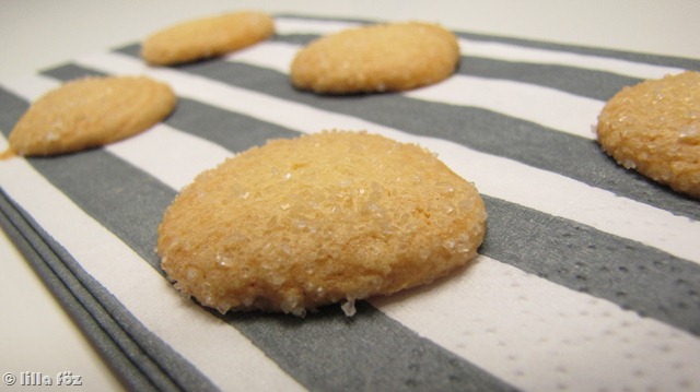 Előveszek két fazekat: egy kisebbet (1 literes elég) és egy nagyobbat. A kicsit a nagyra teszem, és annyi vizet öntök a nagyba, hogy a másik éppen ne érjen bele. Leszedem a kisebbiket, elkeverem benne a cukrot, a tojásokat és a vanília kivonatot, és közben felforralom a vizet. Miután a víz felforrt, lehúzom a tűzhelyről, fölé teszem a kisebbik edényt, és habverővel 10 percig keverem a tojásos masszát. Ezután leveszem a forró vízről, és még 5 percig keverem, kézzel vagy esetleg géppel (nekem 1 karos habverőm van – azaz pont úgy néz ki a szára, mint a kézi habverő, ez megfelelő volt, nem tudom, hogy a hagyományos is jó-e ehhez). A végére ki kell világosodjon, és sűrű habbá kell váljon. Két-három részletben beleszitálom a lisztet, és homogén masszává keverem. A habzsákra nagy lyukú fejet teszek, belekanalazom a masszát, és két sütőpapírral bélelt tepsibe kb. 2 cm átmérőjű korongokat nyomok (spirálból is ki lehet alakítani, szét fog folyni a tészta). Megszórom a tetejüket kristálycukorral, és szobahőmérsékleten 4-5 órát pihentetem. Előmelegített sütőben, 150 fokon, 20 perc alatt megsütöm.