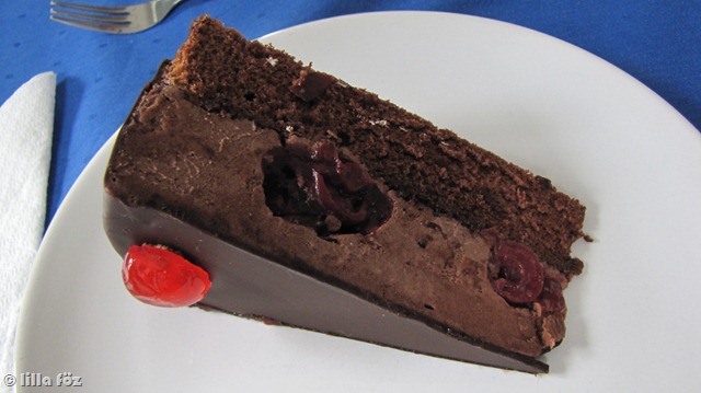 A múlt héten a fekete erdő nyert – hát ez minden várakozást alulmúlt. Nekem már a pultban rohadt gyanús volt eza gigantikus magasság, és a tekergőző “hab” a tetején. Nos már megint igazam lett. Iszonyatosan szar volt, én ilyen rossz süteményt ezer éve nem ettem. Az egész miskulancia úgy, ahogy volt feltapadt az ember szájpadlására. Kizárólag végstádiumú cukor és zsír függőknek ízlelőbimbók nélkül. Esetleg pálinkázás elé, kibélelni zsírral a gyomrot, hogy többet lehessen inni (ha a zsíros-lilahagymás kenyér már snassz lenne). Össznépi kiakadás, és örülés, hogy csak 4 szelet tortát hoztunk, és értetlenkedés a tanácsadóinkon, akik ezt javasolták.