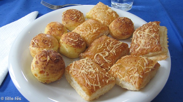 A képen a kis kerek. Nem ‘úá’, de egy teljesen okés sajtos pogácsa, egyben is be lehet falni, de nem morzsálódik rémesen, ha kettéharapja az ember.
