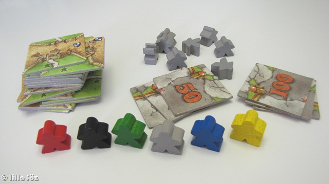 minden színből 1-1 nagyobb bábu, ez a kié a mező kié a vár ‘összetűzéseket’ teszi izgalmasabbá, extra kombinálásra ad lehetőséget (ha egy valamin többen állnak, akkor azé, aki több bábut pakolt rá, ez a nagy 2-t ér).