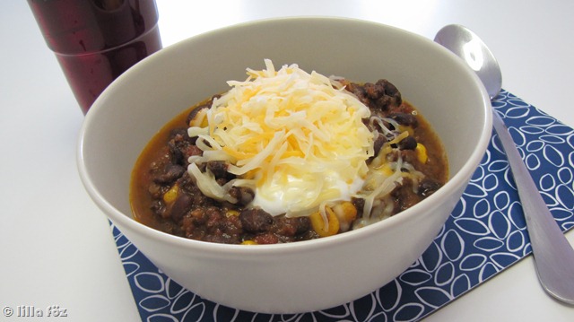 A hagymát apróra vágom, kb. 5 percig párolom a felhevített olajban, azután hozzáadom a zúzott fokhagymát és a marhahúst, és addig sütöm, amíg a hús mindenhol kifehéredik. Felöntöm a borral, fűszerezem (só, bors, chili, római kömény, cukor, ecet), hozzáadom a lecsöpögtetett babot, a paradicsomkonzervet és az alaplevet, és fedő alatt, kis lángon, többször ellenőrizve 2-2,5 óra alatt megfőzöm. Megkóstolom, ha szükséges, szórok még bele fűszert, belekeverem a kukoricát, és tejföllel és sajttal megszórva tálalom.