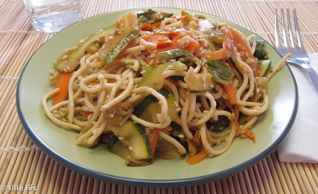 A sárgarépát meghámozom, levágom a cukkini két végét, mindkettőt 4-5 cm hosszú darabokra vágom, és a zöldséghámozóval „felszeletelem”. A tésztát leöntöm forró vízzel, és lefedve állni hagyom, amíg megpuhul, majd leszűröm. Az újhagymát ferdén felszeletelem, és a felhevített olajon pár percig sütöm, majd mellédobom az áttört fokhagymát, és egy perc után hozzáadom a zöldségeket. Pár percig párolom, a citromlével, a szójaszósszal, a kínai fűszerkeverékkel, és ha szükséges, egy kis sóval fűszerezem. Beleforgatom a tésztát, megszórom a szezámmaggal, és melegen vagy hidegen tálalom.