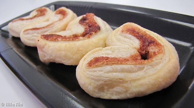 A leveles tésztát vékonyra nyújtom (én az előnyújtott lapot még egy kicsit vékonyabbra nyújtottam), és kb. 15-18 cm széles csíkokra vágom. A csíkokat megkenem olvasztott vajjal, majd megszórom cukorral és fahéjjal (szűrő segítségével a legegyszerűbb és a legegyenletesebb a végeredmény). A csíkok két szélét behajtom a közepéig, majd félbehajtom, így 4 rétegűek lesznek. Egy tepsit kibélelek sütőpapírral, a sütőt előmelegítem 200 fokra, és kb. 1 cm vastagon felszeletelem a tésztát. Ahol 1 hajtás van, azaz a majdani szív „csúcsánál” kicsit összenyomom a tésztát, és tepsibe fektetem a süteményeket. Kb. 10 perc alatt megsütöm, és a tepsiben hagyom kihűlni.