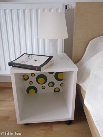A kedves gépész tervező (és az építész is, mert rá kell bólintania a gépész tervekre) elképesztően rossz helyre, elképesztően rossz alakú radiátort tervezett a lakásba. Zárójeles megjegyzés magamnak: padló-, plafon- vagy falfűtés ha egyszer házam lesz. Ennek köszönhetően az ágy egyik oldalára nem tudtunk éjjeliszekrényt tenni, ami önmagában is bosszantó, de úgy, hogy mindketten allergiásak, szemüvegesek és olvasás-mániások vagyunk végképp nagyon rossz. Elég sokat gondolkodtam azon, hogy mi lenne a jó megoldás, mindenképpen valami kisbútor kellett, de az elég lassan dőlt el, hogy valami gurulós vagy egy kisebb láda.