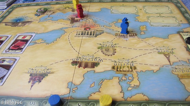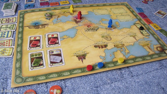 A játék egy “egydarabos” szerző műve, nincsenek hozzá kiegészítők, változatok, nem egy teljes univerzum, mint a Catan vagy a Carcassone. Bár a játék neve Théba, és a dobozon is egy egyiptomi jelenet látható, a játék helyszíne nem korlátozódik erre az egy helyszínre. Az összes ókori civilizáció helyszínét meg kell látogatni leletek után kutatva (Kréta, Egyiptom, Palesztina, Mezopotámia, Görögország). Ráadásul ott van jópár európai főváros, ahol tudást szerezhetünk (és kell is szereznünk az ásatásokhoz) valamint konferenciákon való részvétellel győzelmi pontokhoz juthatunk. A régészkedés része szerintem roppant jópofa, minden helyszínhez tartozik egy zsák, benne korongokkal, a korngok egy része üres, ez jelképezi a homokot, a másik részükön pedig különböző pontértékű leletek vannak (görög váza, Mükénéből aranymaszk, írnokszobor és hasonlók). Aki ásatást folytat, húz a zacskóból, majd miután végzett, a “homokot2 visszadobja. Így aztán aki később ásat az adott helyszínen, rosszabb esélyekkel indul. Ettől természetesen a szerencsefaktor is viszonylag magas a játékban, ami nem feltétlenül probléma, gondolkodós játékok után levezetőnek, vagy fáradtabb napokra, esetleg olyanokkal való együttjátszásra, akik lusták gondolkodni(vagy kibírhatatlanul sokáig gondolkodnak) szerintem tökéletes.