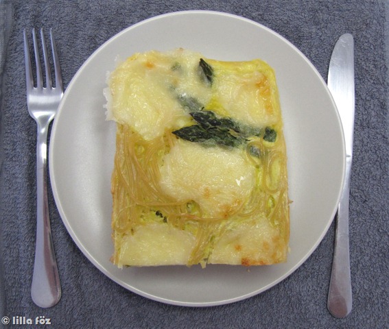 Ez az étel teljesen másnak indult, csak az „A terv” totális kudarcba fulladt. Ami nem feltétlenül baj, történnek néha gikszerek, ez minden tevékenység velejárója, hogy néha nem úgy sikerül, ahogy eltervezzük. A baj az, amikor ott állok este fél 11-kor a konyhában egy nagy tál tojásos spárgával, amit valahogyan fogyasztható formába kell önteni, mert így éhen maradunk másnap, és nincs kb. se egy tiszta edény se egy tiszta négyzetcentiméter. Elő kellett tehát állni egy „B tervvel”, ami jelen esetben azt jelentette, hogy gyorsan megfőzök egy kis spagettit, összekeverem a tojásos szósszal, és betolom kb. 15-20 percre a sütőbe. Nagyon jó lett. Indíthattam volna rögtön ezzel, megkímélve magam némi bosszúságtól (és egy kiadós mosogatástól).