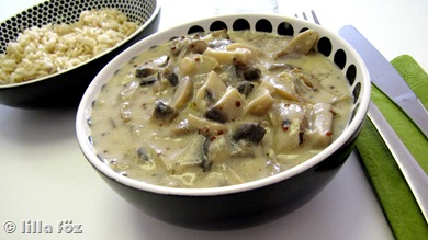 A vargányát kb. egy fél órára beáztatom, az újhagymát felkarikázom, a laskagombát és a csiperkét megtisztítom, és nagyobb darabokra vágom. Egy serpenyőben felhevítem az olajat, pár percig sütöm rajta az újhagymát és a zúzott fokhagymagerezdet, majd hozzáadom a kétféle friss gombát, és néha megkeverve, pár percig pirítom. Hozzáadom a bort, a tejszínt, a fűszereket, a citromlevet és a vargányát és kb. 10 percig főzöm. Ha a 10 perc leteltével nem elég sűrű a mártás (vagy sűrűbbet szeretnék), akkor egy kávéskanálnyi keményítőt elkeverek egy kevés hideg vízben, és besűrítem vele. Rizzsel vagy krokettal tálalom.