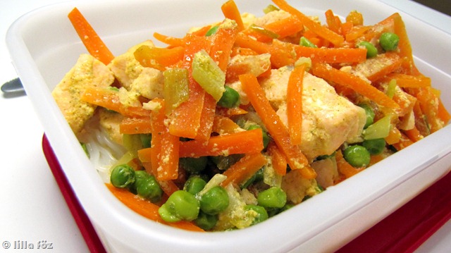 Az üvegtésztát elkészítem a csomagoláson található utasítás szerint, és félreteszem. Az újhagymát vékonyan felkarikázom, és a sárgarépát julienne-re vágom. Az olajon 1-2 percig sütöm a hagymát, majd hozzáadom a curry pasztát, és egy perc sütés után felöntöm a tejjel és a zöldségalaplével. Belekeverem a sárgarépát és kb. 5 percig főzöm. Közben a lazacot kis kockákra vágom, majd a borsóval együtt a mártáshoz adom, és még kb. 5 percig főzöm. Ha szükséges, sózom, borsozom, és az üvegtésztával tálalom.