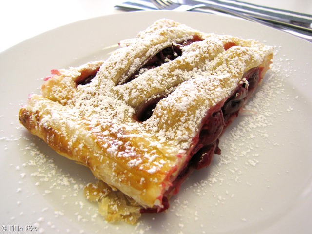 A meggyet összekeverem a cukorral, és félreteszem kicsit állni (én ezen a ponton megnéztem egy focimeccset). Majd leszűröm a levét, elkeverem benne a keményítőt, felforralom, hogy besűrűsödjön, és a meggyszemekhez keverem. Az egyik leveles tésztát kitekerem, a felét (a hosszabbik oldallal párhuzamosan) éles késsel vagy rácsozóval bevágom, a másik felére pakolom a meggy felét, és a rácsozott oldalt ráhajtom a töltelékre. Az oldalakat alaposan összenyomkodom, és visszahajtom, hogy biztosan ne nyíljon ki sütés közben. Sütőpapírral bélelt tepsibe teszem, ugyanígy megcsinálom a másik rudat is, majd megkenem a tetejüket a felvert tojással, és előmelegített sütőben, 200 fokon (légkeveréssel) 15-20 perc alatt megsütöm. Porcukorral megszórva tálalom.
