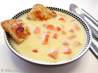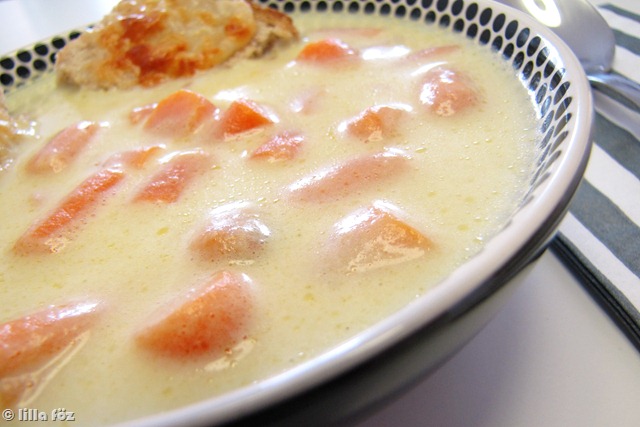 Kellett valamilyen leves a meggyes rétes elé, boltba menni nem volt kedvem, meg minek ha elég sok alapanyag van még itthon, úgyhogy körülnéztem a  hűtőben és a fagyasztóban. Találtam némi mirelit bébi sárgarépát, zeller majdnem mindig van, tejszín szintén, úgyhogy összekombináltam őket, hátha valami jó sül (fő) ki belőlük. És úgy is lett, nem vagyunk a levesek nagy barátai, de ez finom volt.