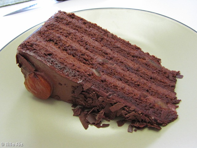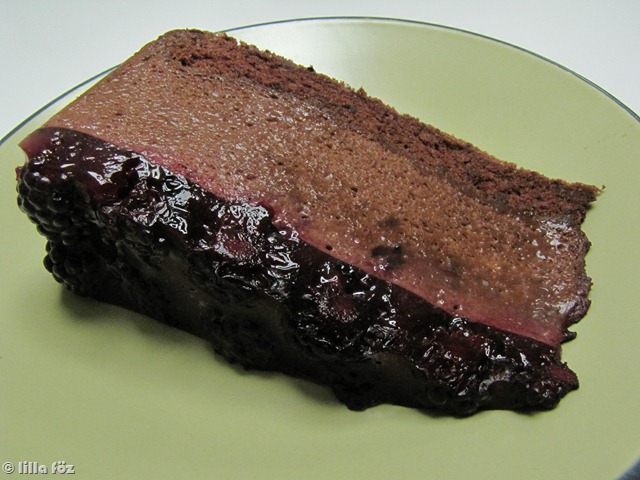 Magas kakaós krém a tetején szederrel és tortaszelével. A krém jó kakaós volt, de nekem túl gumiszerű, igazából ezt extraként válogattuk be, mert nem volt túl sok esküvői tortának alkalmas a kínálatban – a diótortát és az eszterházyt a dió-allergia, az oroszkrémet a szemmel látható mazsolák miatt kizártuk. Amúgy nem rossz, de a többivel nem egy súlycsoport.