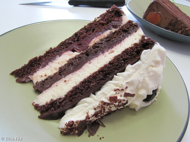 A piskótát meglocsolták meggylével, a meggyzselé normális a tortán belül, a tetején jó a hab, nem volt kérdéses, hogy ez egy 9 pontos torta. Nekem a tetején lévő meggyszem nem ízlett, de nagyságrendekkel jobb volt, mint a tűzpiros koktélcseresznyék. Azt nem tudom eldönteni, hogy melyik a jobb feketeerdő torta, ez vagy a pomázi (Dunai vagy mi a neve). Egymás mellé kéne őket tenni összehasonlítás végett.
