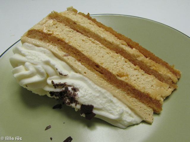 Ez volt eddig az a torta, amire mindketten azt mondtuk, hogy ‘úá’ (külön-külön sem volt eddig ez a véleményünk egyikről sem). Úgyhogy megszavaztuk ezt. Kellemesen habos krém, erőteljes karamell íz, és rendes hab a tetején.