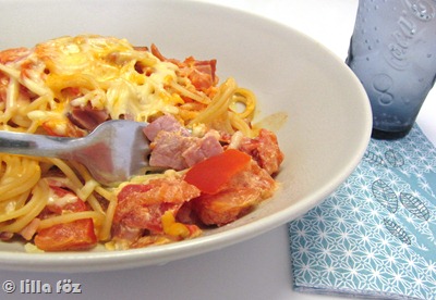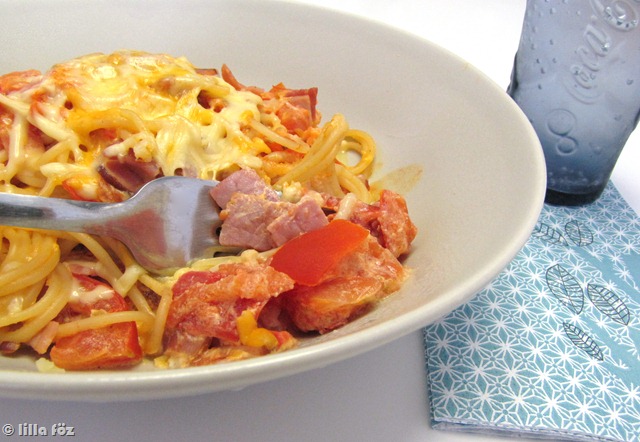 A spagettit megfőzöm, és közben elkészítem a mártást. A paradicsomot kb. 1×1 cm-es kockákra vágom, és s sonkát felcsíkozom. egy serpenyőbe öntöm a tejszínt, belekeverem a sonkát a paradicsomot,a zúzott fokhagymát és a majorannát, és kb. 10 percig főzöm. Egy kicsit megsózom majd összekeverem a leszűrt tésztával. A reszelt sajttal megszórva tálalom.