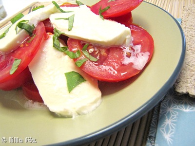 A paradicsomot és a sajtot karikákra vágom, két tányérra rakom, vágok rá egy kis friss bazsalikomot, és csöpögtetek rá pár csepp olíva olajat.