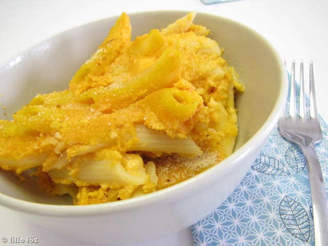 Avagy sütőtökös mac’n’cheese. Én azt hiszem egy kicsit sok sütőtököt raktam bele, mert a sajt ízét alig lehetett érezni, de végül is szeretjük a tököt és hát ennyi volt itthon…