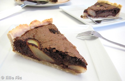 A lisztből, vajból, porcukorból és sóból kevés hideg vízzel omlós tésztát gyúrok, kibélelek vele egy 26 cm-es kapcsos tortaformát (legyen szép magas pereme) és kb. 1 órára hűtőbe teszem. Sütőpapírt teszek bele, és rakok rá egy kis rizst vagy babot nehezéknek, hogy sütés közben ne púposodjon fel. Előmelegített sütőben, 180 fokon (légkeveréssel) 15 percig elősütöm. A körtéket meghámozom, négybe vágom és eltávolítom a magházukat. Citromleves vízben pár percig főzöm a körtét, majd leszűröm, és félreteszem hűlni. A csokoládét összetöröm és egy tálba rakom, majd ráöntöm a forró kávét és simára keverem. miután kicsit lehűlt a csokoládé, belekeverem a cukrot és a vanília-kivonatot, majd egyenként hozzáadom a tojásokat. Végül belekeverem a sütőport, a lisztet és a mandulát. Az elősütött tésztáról leszedem a babot és a sütőpapírt, kirakom a körtével, ráöntöm a csokoládés tésztát, és 140 fokon kb. 40-45 perc alatt készre sütöm. A formában hagyom kihűlni, tálalás előtt lehet még csicsázni egy kis olvasztott csokoládéval.