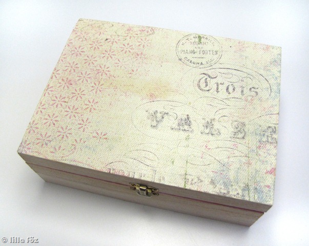 Hatodik lépés: lakkozás. Ehhez is a dekupázs ragasztót használtam, a tetején a papíron 2 vagy 3x, az oldalán és alján 1 vagy 2x mentem végig, persze több rétegben, kellően nagy száradási időket hagyva.