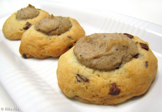 A múltkori lekváros-mandulás ‘thumbprint cookie’ volt az alap, kicsit változtattam a tésztán, és lekvár helyett gesztenyekrém került bele. A nem reprezentatív kóstoltatásom eredménye, hogy extrém édesszájúak tehetnek bele még cukrot (és hogy nagyon jól megy mellé a friss – jelen esetben felolvasztott mirelit – meggy).