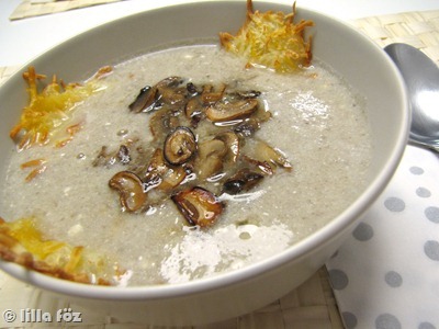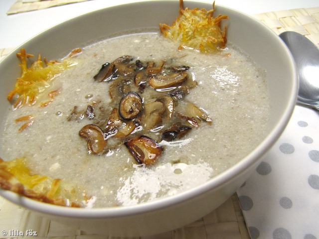Kevés olajon pár percig sütöm az apróra vágott hagymát, majd hozzáadom a felkarikázott zellert és a felszeletelt gomba 2/3-át. Pár percig sütöm, majd hozzáöntöm a bort, némi alaplevet és fedő alatt 10 percig főzöm. Közben elkészítem a sajtchipset, egy tepsit kibélelek sütőpapírral, reszelt keménysajtból kis kupacokat teszek rá, és előmelegített, forró sütőben pár percig sütöm. A maradék gombát egy serpenyőben, kevés olajon nagy lángon jól megpirítom. A levest leveszem a tűzhelyről, kicsit hűlni hagyom, összeturmixolom, kb. 2 dl tejfölt vagy tejszínt adok hozzá, sózom, borsozom, és összeforralom. A levest a pirított gombával, sajtchipsszel és apróra vágott petrezselyemmel megszórva tálalom (ez utóbbit bele is lehet keverni).
