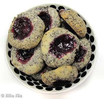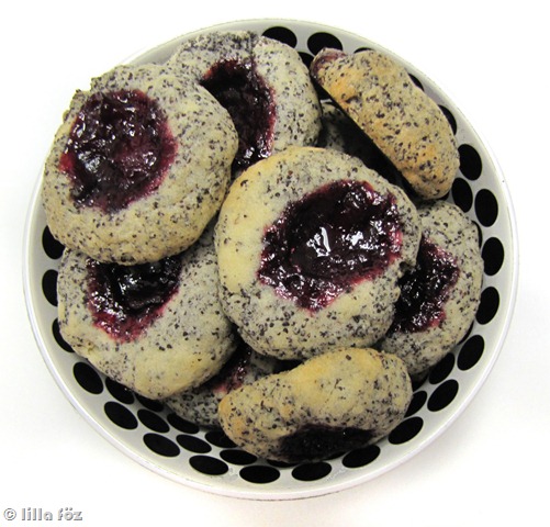 A puha vajat habosra keverem a cukorral, majd beledolgozom a tojást. (a vajpuhításra rá szoktam kicsit segíteni a mikróban). Néhány részletben belekeverem a lisztet és a mákot, és kb. 30 percre beteszem a hűtőbe. Egy tepsit kibélelek sütőpapírral, és a sütőt előmelegítem 180 fokra. a masszából kis diónyi golyókat formázok, a tepsibe teszem, kicsit ellapítom és az ujjammal mélyedést nyomok beléjük. Sütés közben nőni fognak, legyen köztük elég hely (a maradék tésztát mindig visszateszem a hűtőbe). egy kiskanállal lekvárt teszek a mélyedésekbe és kb. 20 perc alatt megsütöm a kekszeket.