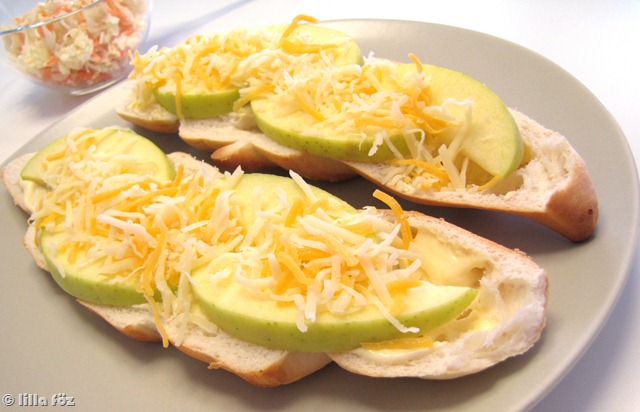 Az alma magházát kivágom (meghámozni nem kell), lereszelem kislyukú reszelőn, meglocsolom pár csepp citromlével. Összekeverem a reszelt sajttal, és kevés majonézzel (vagy majonéz és tejföl keverékével). Nem kell folyós legyen, csak annyi majonéz kell, hogy összeálljon. Kenyérre/kiflire kenem.
