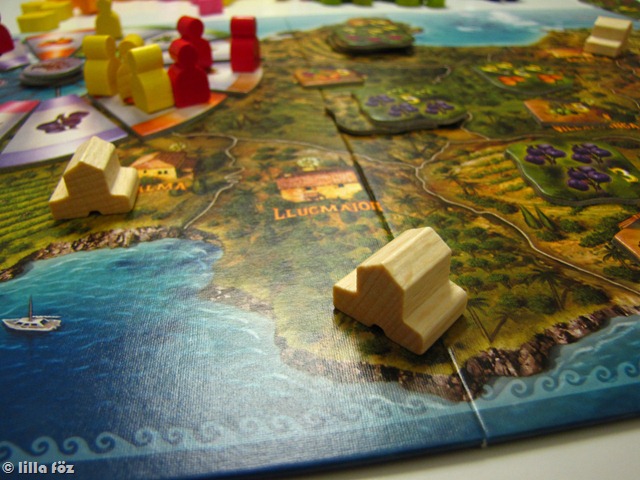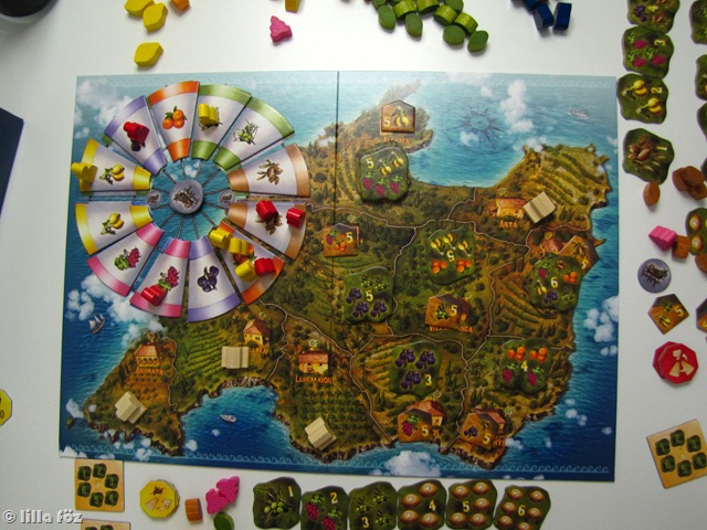 Ezt a játékot Levinek választottam Karácsonyra, és szerencsére mindketten maximálisan elégedettek vagyunk vele – nemhiába ragadtam rá a fórumokra, böngésztem a boardgamegeek-et, és jártam körül a témát. A játék neve (‘finca’) a spanyol szigetek ültetvénnyel körülvett udvarházait jelenti. Ez kellőképpen fedi is a játék lényegét, ugyanis a táblán Mallorca szigete látható, 10 majorságra osztva, melyeken folyton változó gyümölcs-igények jelennek meg. A táblán van még egy szélkerék is, melyen körbe lépdelve gyümölcsöket tudunk szerezni (ezek kis színes fa elemek, nagyon jó néznek ki), majd ha van szamarunk, és kellő mennyiségű gyümölcsünk, szállíthatunk. A szállításért természetesen pont jár, és a játék végén az nyer, akinek a legtöbb pontja van (tehát sok játékkal ellentétben, csak a játék végén van értékelés). Egyszerű, változatos, lehet benne taktikázni, remekül újrajátszható, nálunk szerintem hosszútávú kedvenc lesz.