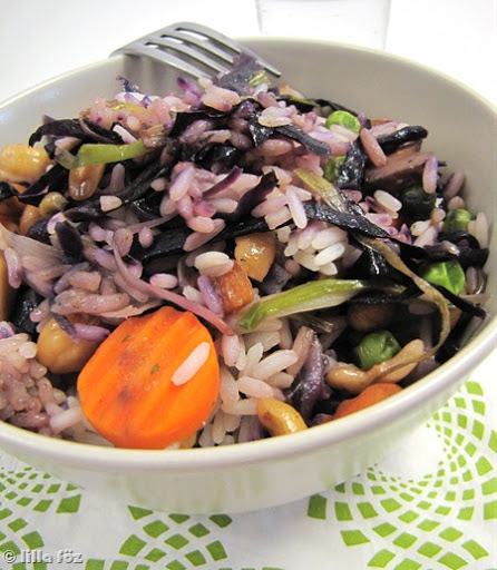 A rizst megfőzöm, a káposztát vékonyan felszeletelem, a póréhagymát először 5 cm hosszú darabokra, majd hosszú vékony csíkokra vágom. Egy nagy serpenyőben felhevítem az olajat, pár percig sütöm rajta a káposztát és a póréhagymát, majd hozzáadom a fokhagymát és a mirelit zöldségeket. Addig sütöm őket együtt, amíg a mirelit zöldségek felolvadnak és nem túl puhára párolódnak (ezek általában blansírozottak, ezért nem kell nekik túl sok idő). A zöldségeket a szezámolajjal, ecettel, szójaszósszal (és chilivel) fűszerezem, összekeverem a kesudióval és a mogyoróval, végül összeforgatom a rizzsel. Megkóstolom, és ha szükséges, sózom, borsozom.