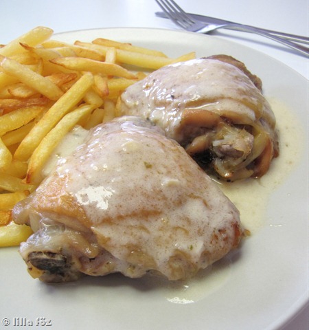 Stahl Judit gyors húsos ételek című könyvéből van a recept, kicsit nekem macerás, az idetesszük-odatesszük, mártáskészítés a végén stb., de végül is nem bonyolultak a lépések, és finom a végeredmény. Akkor mondjuk kicsit kiakadtam a saját hülyeségemen, amikor a sütőből kivett serpenyőnek megfogtam a nyelét, hogy akkor én most mártást készítek, és 4 ujjam és a tenyerem égett (kicsit) hólyagosra. Szerencsére van aloe vera bokrom, másnapra már csak az emlékeztetett a malőrre, hogy helyenként sokkal simább volt a bőr a kezemen.