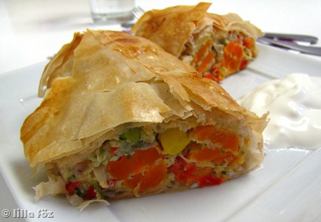 A zöldségeket megpárolom, majd alaposan lecsöpögtetem. A túrót összekeverem a tojásokkal (én 10 dkg összetört konzerv spárgát is raktam bele, mert maradt előző napról), sóval, borssal, szerecsendióval és tetszés szerinti zöldfűszerekkel fűszerezem. Végül belekeverem a reszelt sajtot, a kihűlt zöldségeket és a zsemlemorzsát. A sütőt előmelegítem 200 fokra (légkeveréssel) és egy tepsit kibélelek sütőpapírral. A réteslapokat kettévágom, és a szokásos olajjal kenegetős módszerrel hármasával egymásra teszem őket. A 4 tésztán elosztom a tölteléket, feltekerem a mini rétes-rudakat, a tepsiben megkenem a tetejüket a felvert tojással, majd megsütöm. Langyosan, tejföllel tálalom.