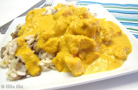 Közben kevés forró vizet öntök a sáfrányra, és a mandulát (barna héj nélkül, egyébként mindegy, hogy egyben van, szeletelt, vagy csíkokra vágott) serpenyőben szárazon megpirítom, majd beleteszem az aprítóba. Kevés vajon megpirítom a húst, és közben összeállítom a mártást. A darált mandula mellé dobom a megsült fokhagymagerezdeket, hozzáöntöm a sáfrányos vizet és a tejszínt, és simára turmixolom/darálom. Ha szükséges vízzel, vagy fehérborral hígítom a mártást, a húshoz öntöm, sózom, borsozom, és összeforralom. Rizs, bulgur, kuszkusz illik hozzá.