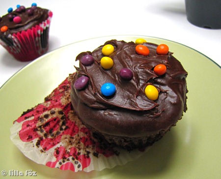 A krémen kissé változtattam, mert egyrészt nem volt itthon elég étcsokoládé (ne szépítsük a dolgot, a vöröslencséből kukacok keltek ki és megettek egy tábla csokoládét, ellettem volna még egy darabig a kukacos csoki látványa nélkül), a tejcsokoládé mellé pedig nem akartam még cukrot tenni, ezért tejfölt raktam a krémbe, hogy meglegyen a kellő mennyiség és állag, és amúgy is párszor már bevált a csoki-vaj-tejföl krém a muffinok tetejére.