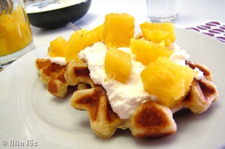 Volt itthon egy ananászom, és egyéb ötlet híján úgy döntöttem, hogy sütök egy adag gofrit, túrókrémet kenek rá, és a tetejére pakolom az ananászt. Azt vettem észre, hogy 3 féle gofrirecept van, vannak a kevert tésztások 1 egység zsiradék-1 egység cukor-1 egység liszt aránnyal, ezeket általában mellőzöm, mert minek hizlaljon annyira, vannak a kelttésztások, ezeket meg az élesztő miatt hanyagolom, és van a harmadik csoport, elég híg tésztával, közepes mennyiségű zsiradékkal, és nagyon kevés cukorral. Ez az abszolút befutó nálam. Ez most egy joghurtos változat, Martha Stewart receptje némileg átalakítva.