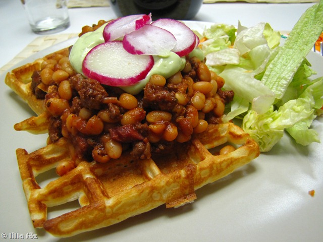 A gofrihoz a tojást összekeverem a tejjel és az olajjal, majd beleszitálom a lisztet,a sütőport, és kicsit megsózom. Nagyjából homogénre keverem, majd vékonyan kiolajozott gofrisütőben megsütöm. A megsült gofrik (fejenként 2 db bővel elég) tetejére pakolom a csilis babot, salátát teszek mellé, és teszek rá 2-3 féle toppingot. Én most tejföllel összeturmixolt avokádót és retket használtam.