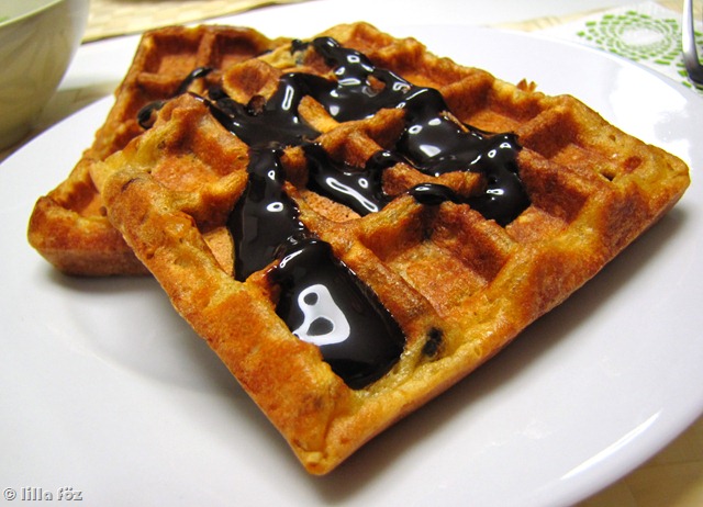 Annyi jó gofri receptem van már, hogy nehéz eldönteni, melyik a legjobb. Azt hiszem mindig az aktuális. Ez is egy nem túl édes tésztájú, elég ropogós, és valami hihetetlenül “habos” változat. Még a csokidarabok nélkül is dobogós lenne, de azzal együtt már… A recept egyébként innen van, én annyit változtattam rajta (azon kívül, hogy a negyedét csináltam csak meg), hogy író (‘buttermilk’) helyett tejet raktam bele. Lehet trükközni, hogy a tejbe kevés citromlevet tesz az ember, és pár percig állni hagyja, vagy kever hozzá egy kis joghurtot. De egyszerűen tejjel is remek. Levi még kivit is pakolt az adagjára, én csak csokoládé-szósszal ettem, mert nem volt itthon kedvemre való gyümölcs (nem is sikerült elérnem csak épp’ az öt egységet).