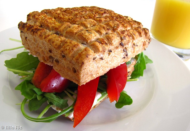 Reggeli: “tönkölykocka” (Lipóti pékség, ezt választottam, mert ez élesztő-mentes, jó választás volt), krémsajt, paprika, rukkola, narancslé (2 egység)