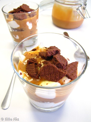 Két pohár aljára pár szem összetört kekszet teszek, arra rákanalazom a joghurt felét, csurgatok rá egy kis karamellt, arra megint keksz-joghurt-karamell jön, végül 1-2 szem keksszel díszítem.
