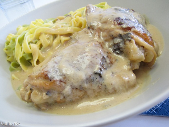 Egy serpenyőben az olajon pár perc alatt mindkét oldalát megpirítom a comboknak, majd kiszedem őket, és kiöntöm a zsírt. A húsdarabokat visszarakom a serpenyőbe, mellédobom a megpucolt fokhagymagerezdeket, és miután kicsit megpirultak, felöntöm a tejjel és hozzáadom a vajat. A tej kb. a hús feléig kell érjen. A citrom héjából zöldséghámozóval 4-5 nagy csíkot vágok, a szószba dobom, beleszórom a zsályát, és félig lefedve 25-30 percig főzöm. Ha nagyon elfő alóla az összes tej, öntök még hozzá. Kiszedem a combokat, a mártásból kihalászom a citromhéjakat, és ha nagyon kevés, némi tej hozzáadásával simára turmixolom. Belekeverem a kukoricalisztet, egy fél citrom levét és felforralom. Visszapakolom bele húst, sózom, borsozom, és főtt tésztával tálalom.