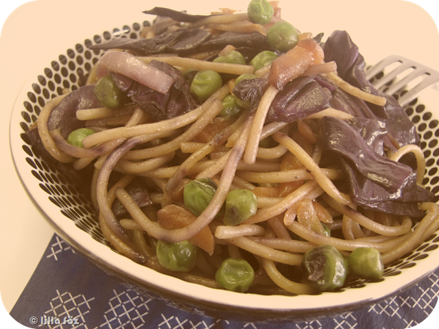 A káposztát és a hagymát vékony szeletekre vágom, és egy kevés olajon pár percig sütöm. Adok hozzá egy kis szójaszószt, pár percig párolom, majd átteszem egy nagyobb fazékba vagy tálaló edénybe (amibe majd bele fog férni az egész, és össze lehet rendesen keverni). A serpenyőbe újra öntök egy kis olajat, és viszonylag nagy lángon pár percig pirítom benne a félbetört tésztát. Ezután vizet adok hozzá, és a rizottófőzéshez hasonlóan megfőzöm – keverés-vízadagolás-keverés-víz stb. Amikor a tészta félig megfőtt, hozzáadom a nagylyukú reszelőn lereszelt sárgarépát és a borsót. Közben bőkezűen locsolom a szójaszósszal, és belenyomom a fokhagymagerezdeket. Miután a tészta megpuhult, és csak kevés lé van alatta (valamint elég sós / szójaszószos), a félrerakott káposztához adom, alaposan összekeverem, és azonnal tálalom.