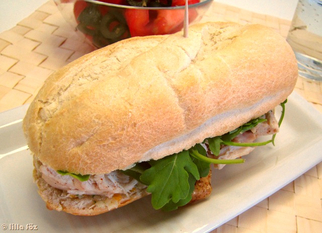A puha vajat összekeverem pár kanálnyi aprított petrezselymet, majd beledolgozom a majonézt. Végül annyi sajtot adok hozzá, amit kényelmesen felvesz, és sózom, borsozom. A félbevágott bagett mindkét oldalát megkenem a szendvicskrémmel, az alját alaposan megpakolom sült csirkével és rukkolával, majd ráteszem a tetejét.