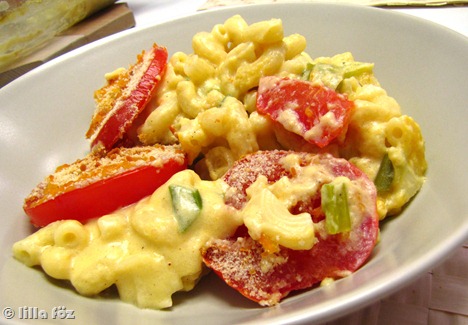 Ehhez képest ez a “fitness változat”. Vagy legalábbis a GoodFood szerint az. Egyébként minimálisat változtattam a recepthez képest, a chilit kihagytam, mert nem igazán szeretjük, a fokhagymát elfelejtettem, és kicsit több tésztát főztem (20 dkg helyett 25 – úgy egyébként kb. 500 kcal adagonként, így nyilván kicsit több). Annyival jobb, mint a nálunk ismeretes “sajtos tészta”, hogy azt el sem tudom mondani. És így, hogy a teteje paradicsommal van borítva, és újhagyma van a mártásban, adagonként több mint 1 zöldség-egységet is tartalmaz, nem csak tésztát és tejzsírt. 🙂