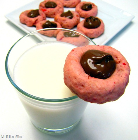 Eper-napokat tartunk, mert amúgy is, meg egy bizonyos eper-gyogyi férjnek erősen közeledik a születésnapja (1 napos epres menü a terv). Ez afféle felvezető (a szokásos péntek esti epres-csokiszószos gofri mellett): epres thumbprint-cookie (benyomott keksz, ha úgy jobb) nutellával töltve. Hatalmas lelkesedés, izgulás és ‘úá’… szóval jól sikerült.