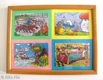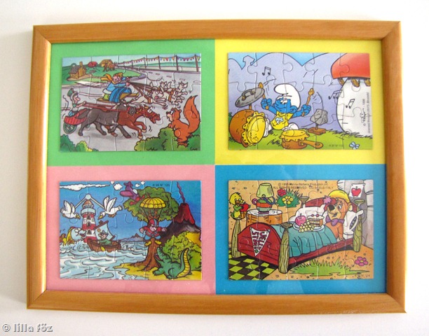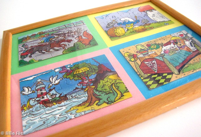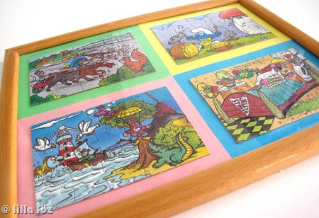 Nem tudom, most mik szoktak lenni a Kinder tojásokban, mindenesetre néhány évvel ezelőtt rendszeresen előfordultak bennük kicsi, 12 darabos kirakók. Egy sorozat általában 4-6 részből állt, és kiadott egy nagy képet. Hát nekem erre sosem volt semmiféle esélyem, ezért az eltérő szériából származókat kombináltam össze egy nagy, osztott képen belülre. (az egész kép, keretestül kisebb, mint egy A/4es oldal)