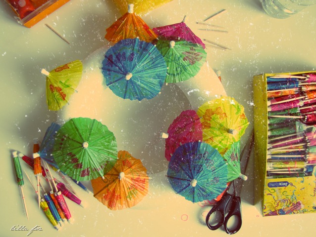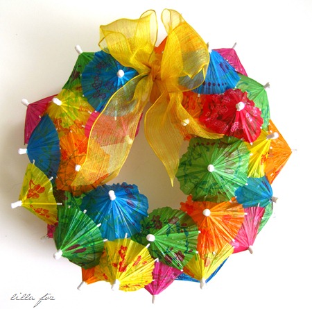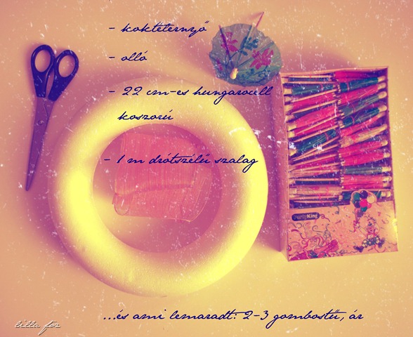 A koktélernyőknek túl hosszú volt a szára, ezért levágtam belőlük. A szalagból levágtam egy kb. 10 cm-es darabot, csomót kötöttem rá, hogy legyen mivel felakasztani, átdugtam rajta a maradék szalagot, és masni kötöttem belőle a koszorúra* (a gombostűkkel rögzítettem a szalag helyét a koszorún, hogy ne forduljon el felakasztás után). Több helyről indulva, kicsit össze-vissza beleszurkáltam a napernyőket az alapba (nem jó elindulni az egyik oldalról, és haladni körben, mert akkor halpikkely szerű fedés lesz belőle). Végül felakasztottam az ajtóra**.
