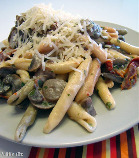 A hagymát apróra vágom, a gombát felszeletelem, és az aszalt paradicsomot 2-3 darabba vágom. Megfőzöm a tésztát, és közben elkészítem a mártást. A zsiradékot felmelegítem egy nagyobb serpenyőben, majd pár percig sütöm rajta a hagymát. Hozzáadom a gombát, pár percig pirítom, majd megszórom a liszttel, és még 1 percig pirítom. Hozzáöntöm a bort, a tejszínt, belekeverem az asztalt paradicsomot és fűszerezem. Végül belekeverem a petrezselymet és a leszűrt, lecsöpögtetett tésztát. Parmezánnal megszórva tálalom.