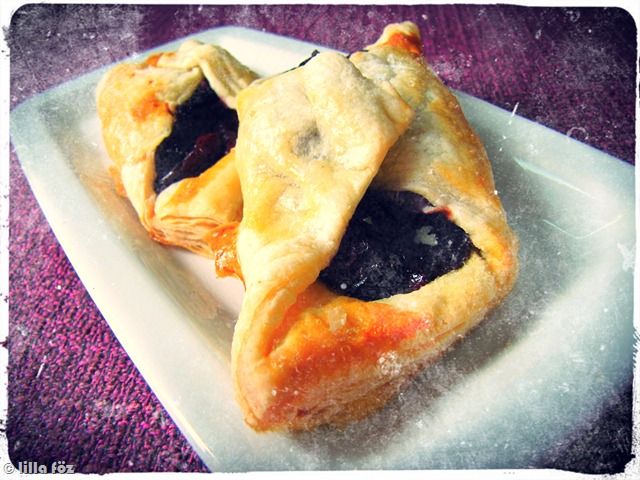 A meggyet összekeverem a kukoricaliszttel, és felfőzöm. Amíg forró, belekeverem a kockákra tört csokoládét, és hagyom nagyjából kihűlni. A leveles tésztát vékonyra nyújtom, és kb. 10-12-cm-es négyzetekre vágom. minden négyzetre rakok a töltelékből, egy-egy átellenes sarkukat összenyomom, és sütőpapírral bélelt tepsibe teszem őket. A papucsokat megkenem felvert tojással, és előmelegített sütőben, 200 fokon megsütöm.